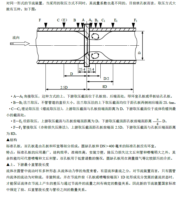 1、角接取壓標準孔板,適用于管徑50mm至1000mm以上。雷諾數(shù)Red的范圍為5×103—107。直徑比為β(為0.22至0.80)。